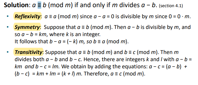 ● Transitive : (a-b) %m = km 이랑 (b-c) %m = lm 이면, a-c = (k+l)m이다.